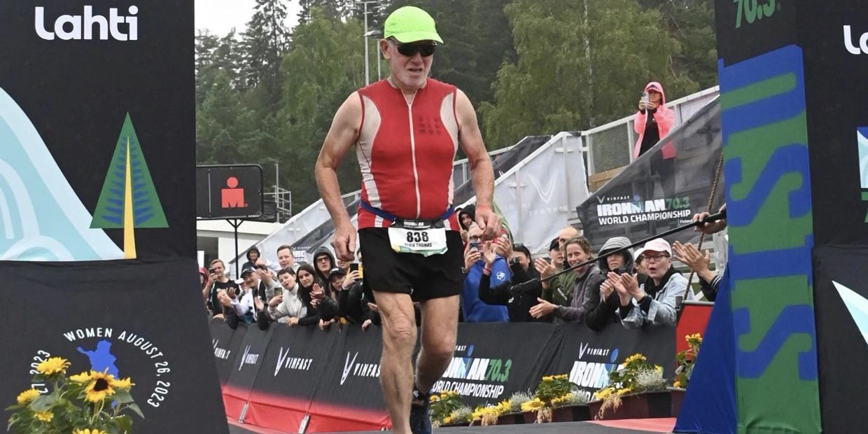 Here I am in Finland at age 80, with severe arterial occlusive disease, finishing the 2023 World Half Ironman Championships in Lahti, Finland. I'm running almost entirely on collaterals in my right foot, as there is no detectable dorsal pedal pulse. Symptoms of similar vascular occlusion are now appearing in my left leg. However, Ironman training-induced collaterals are keeping me going. This demonstrates the power of exercise to overcome peripheral artery disease, due to the body's adaptability to stress.
