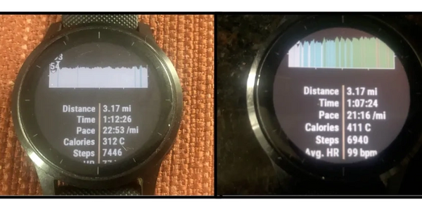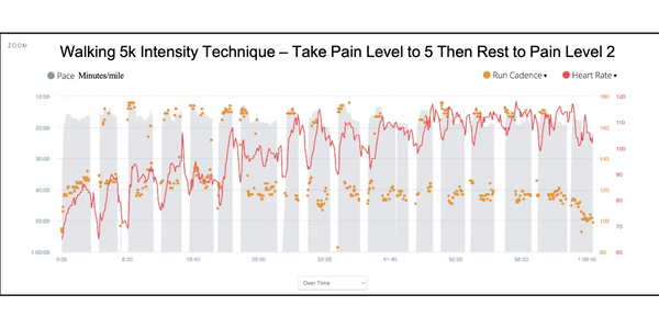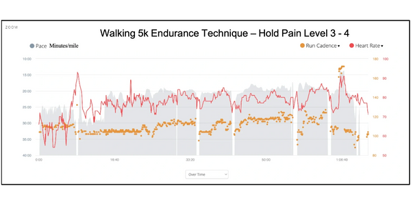 With level 5 claudication pain, I'm forced to stop as my feet slap the ground, risking bruising to the balls of my feet. I then wait, as my calves and feet refill with fresh blood, taking pain to a level 2, then I start again. You can see the difference from the endurance approach, as my pulse climbs. This kicks my ass, for a gain of 5 minutes over the 5k distance. I could not keep this up much longer.